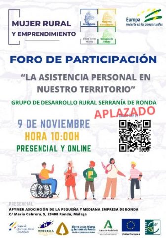 Por causas sobrevenidas, aplazamos el Foro de Participación, “La Asistencia Personal en Nuestro Territorio”, dentro del proyecto de cooperación “Mujer Rural y Emprendimiento”, de esta mañana. Se celebrará la semana que viene. Muchas gracias y disculpad las molestias.