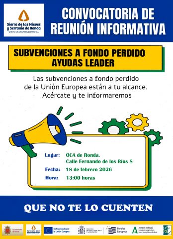 El  miércoles 18 de febrero de 2026, tendrá lugar en la sede de la OCA de Ronda, Calle Fernando de los Ríos, 8, a las 13:00 horas, una reunión informativa sobre las ayudas LEADER recogidas en la Estrategia de Desarrollo Local Leader Sierra de las Nieves y Serranía de Ronda  2023-2027.
